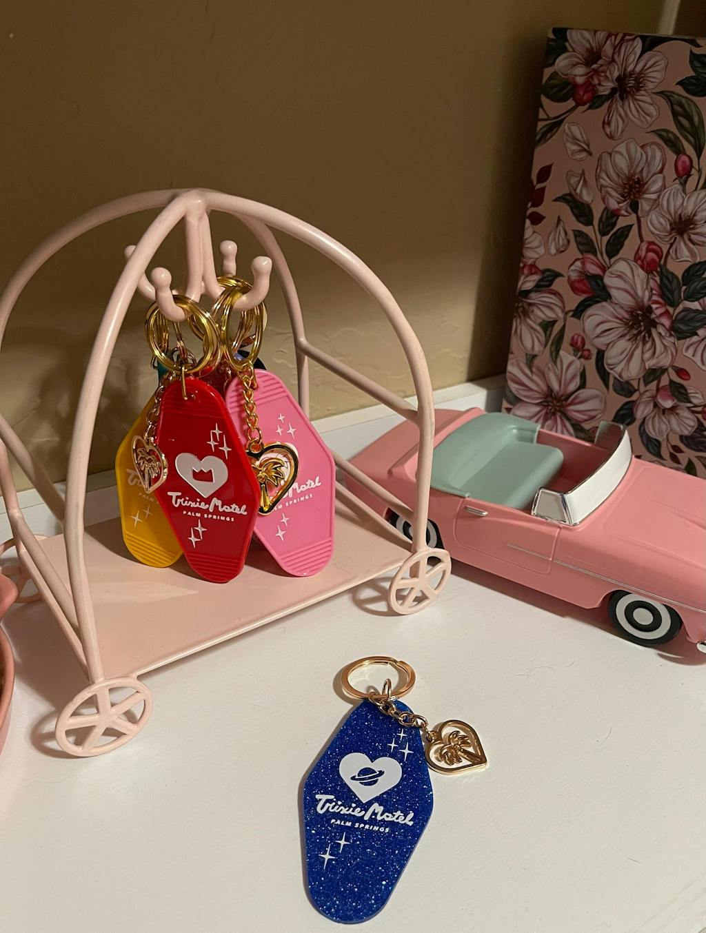 Add a touch of retro glam to your keys with our Trixie Motel keychains. The Atomic Bombshell keychain is glitter blue and features rose gold hardware and a custom motel logo charm, making it the perfect souvenir or everyday trinket for any Trixie or motel lover.